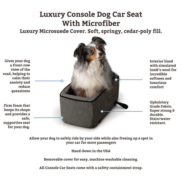 *Happy & Cozy Dogs. Dogs need high-quality comfort, too! Our microsuede or faux suede dog car seats feels just like genuine suede leather without any of the drawbacks. Microsuede is incredibly breathable while also being luxuriously soft to the touch, which means your dog can relax in cozy comfort to help promote the ultimate comfort no matter where your next adventure takes you.
