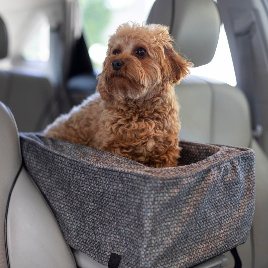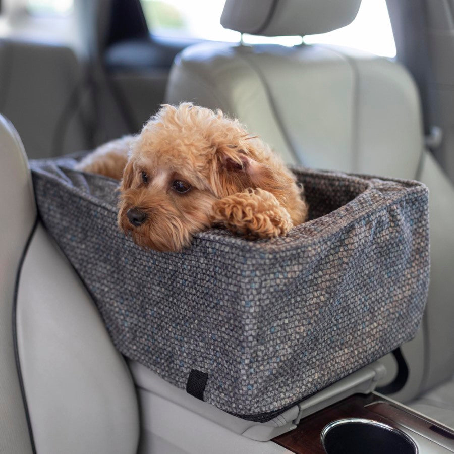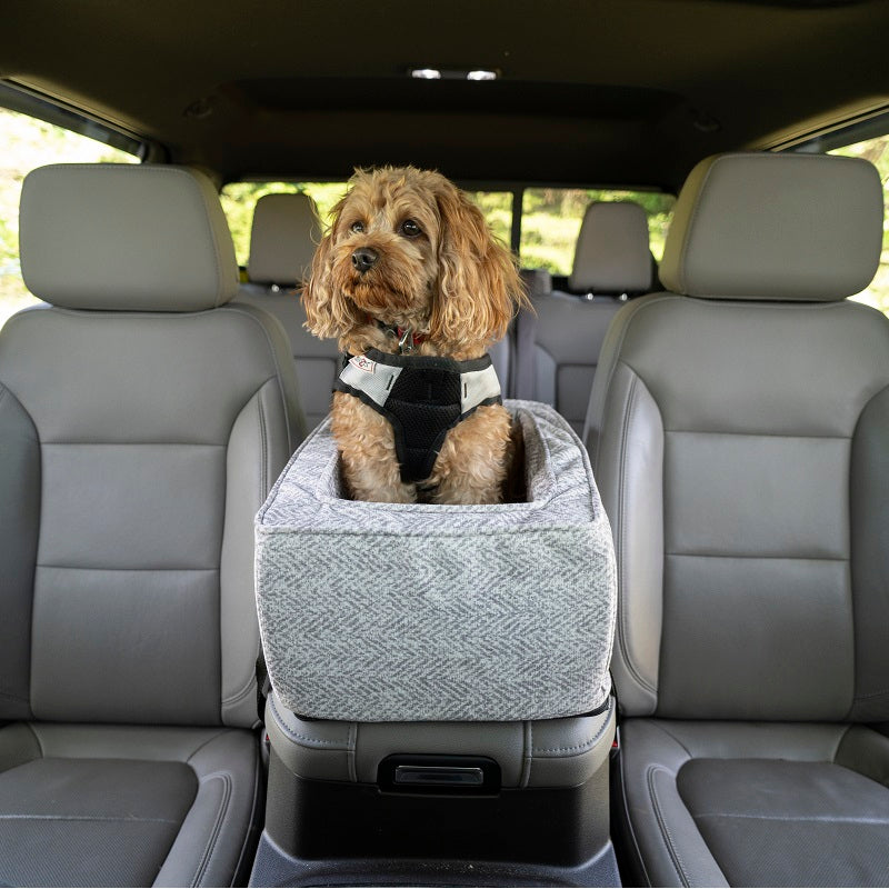 The Console dog car seat gives your dog a front-row view of the road right next to you! Designed for pets up to 12 pounds, it’s especially great for dogs who get carsick or anxious in the car, as seeing outside can help calm anxiety and reduce queasiness. Even dogs who dislike car travel can learn to love it once they have their very own secure, comfortable spot to snooze in and look at the world go by.