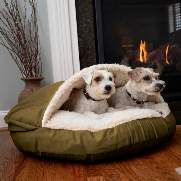 The Luxury Cozy Cave® hooded dog bed gives pets a cozy place to stay warm, comfortable and catch a few Z’s. Often referred to as a nesting dog bed, Snoozer’s Luxury Cozy Cave® is especially soft to the touch thanks to its plush microsuede cover. It’s perfect for pets and dog who enjoy the feeling of staying under the covers and being almost completely enclosed. Dogs can relax in the warm embrace of Sherpa interior fabric, keeping them warm, safe and secure throughout the year. The machine washable, microsuede as soft as it is durable. The cedar/poly filling provides sumptuous comfort and reduces odor.