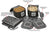 This dog food travel bag includes: Two lined carriers with handles which can be used to store food and/or treats, two collapsible silicone pet travel bowls, one collapsible silicone food scoop, a non-slip placemat, and a drawstring bag which holds the entire set. These dog food carriers can be filled with food while traveling or collapsed for easy storage. The food carriers hold 10 cups total.
