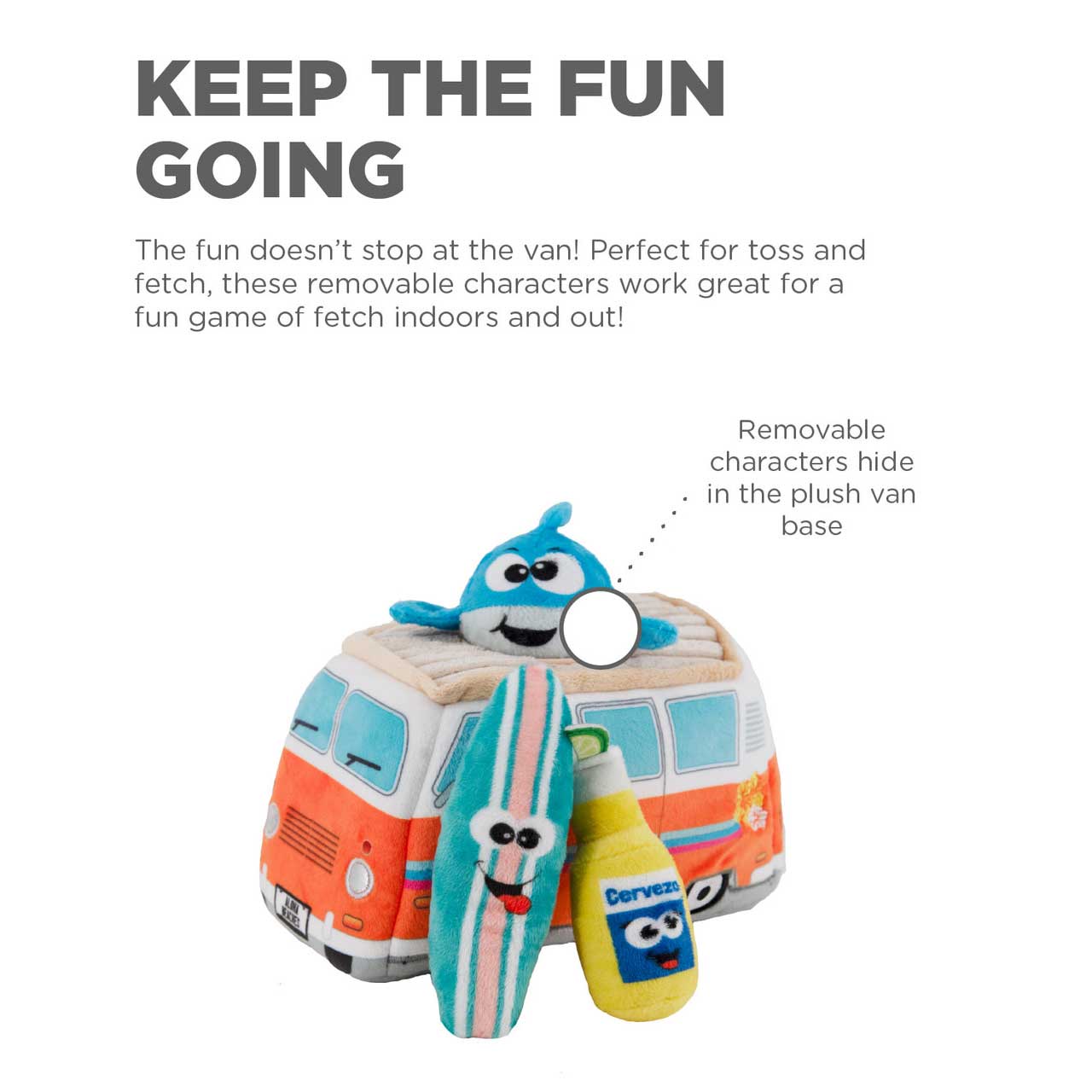 2-in-1 interactive play means double the fun with options to play fetch or hide and seek to keep your dog mentally stimulated. Bound to become your curious canine’s new favorite, our plush hide and seek line of puzzle toys are perfect for supervised fun of all sizes! Just remember to consider your dog’s size and activity level when deciding which toy to get. The Hide A Surf Van dog puzzle is an easy way to get pups engaged for hours of fun! Just fill the van with the shark, beer, and surfboard toys, toss it, and let your dog’s natural hunting instincts kick in!