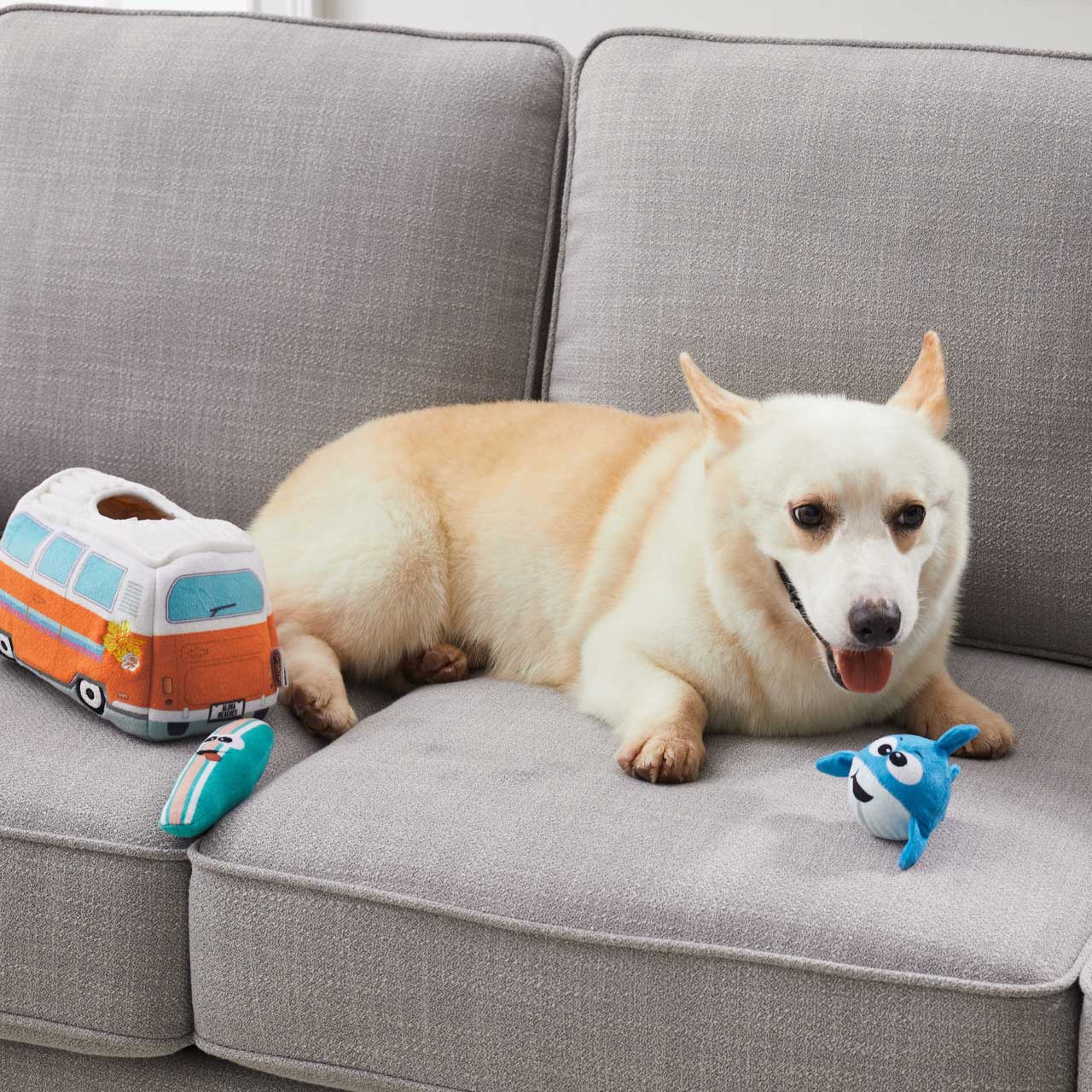 - Toss the toy-filled van, place it on the ground, or take the squeaky plush toys out and launch them for a game of fetch your dog is sure to love!