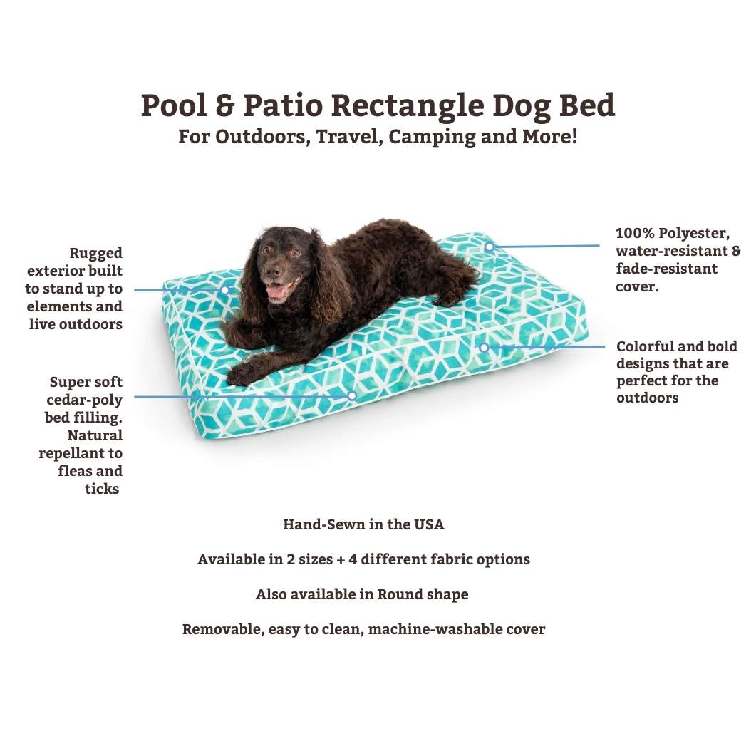 *For Outdoor Lounging and Indoor Living. Snoozer’s indoor outdoor dog bed is the perfect place for your dog to snooze when the family’s relaxing poolside, chilling on the patio, or playing in the yard. It’s also attractive and comfortable enough for daily use inside the home, too! Built to live outdoors, the 100% polyester cover is water-resistant (not waterproof), fade-resistant, and comfortable, so your dog always has a place to relax with the family both inside and out.